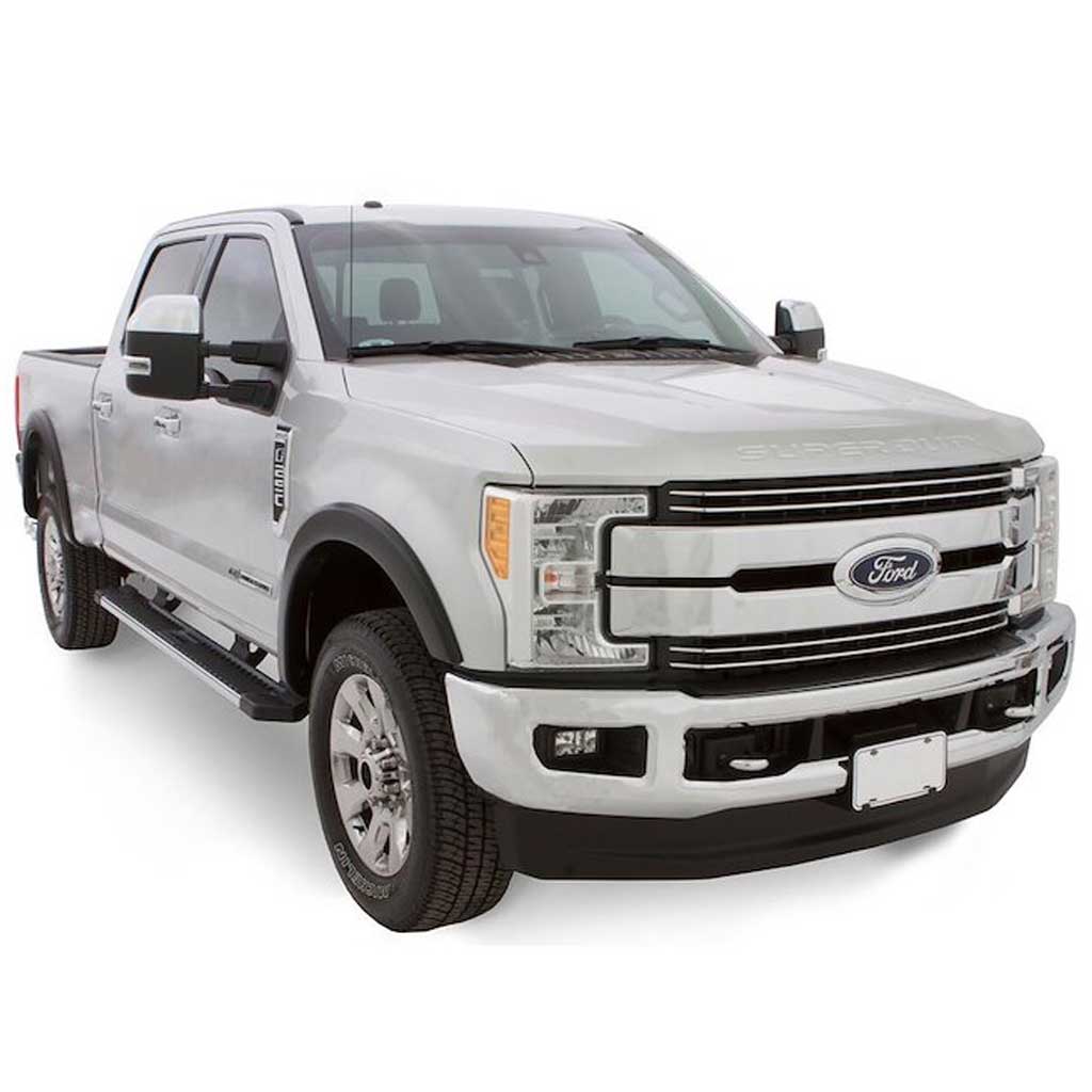 Brettakantar fyrir Ford F-250/350 sem liggja þétt upp að hliðum bílsins og fylgja línunum á yfirbyggingunni. Kantarnir eru 2cm breiðir og gefa kost á breiðari dekkjum á bílinn þinn. Búið til úr endingargóðu Dura-Flex® 2000 ABS plasti, sem er UV-varið, sveigjanlegt og hannað til að þola veðurfar og raunverulega notkun án þess að molna eða fölna. Brettakantarnir setjast fallega að bílnum og vernda yfirbyggingu gegn drullu, grjóti og vatnsslettum frá breiðari dekkjum.