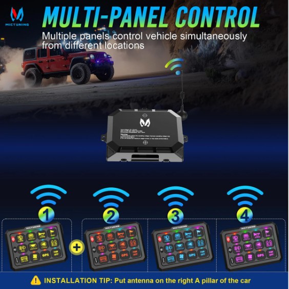 Í pakkanum : Rofaborð, haldari, öryggjabox, festingar og aukahlutir, 5 öryggi (30A x2, 20A, 15A, 10A), 140 límmiðar með merkimiðum, loftnet (með 3 metra snúru) og hleðslusnúra.