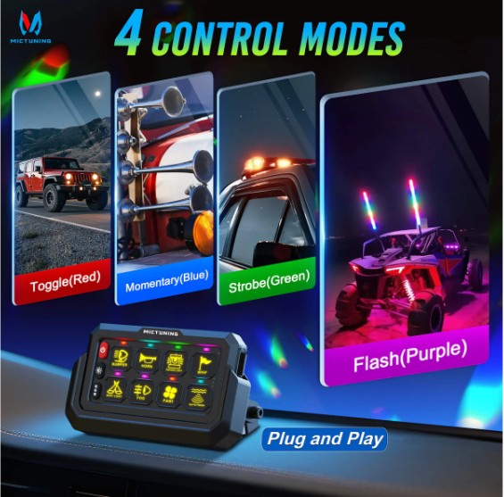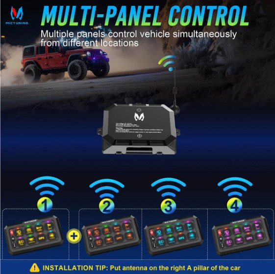 Í pakkanum : Rofaborð, haldari, öryggjabox, festingar og aukahlutir, 5 öryggi (30A x2, 20A, 15A, 10A), 140 límmiðar með merkimiðum, loftnet (með 3 metra snúru) og hleðslusnúra.
